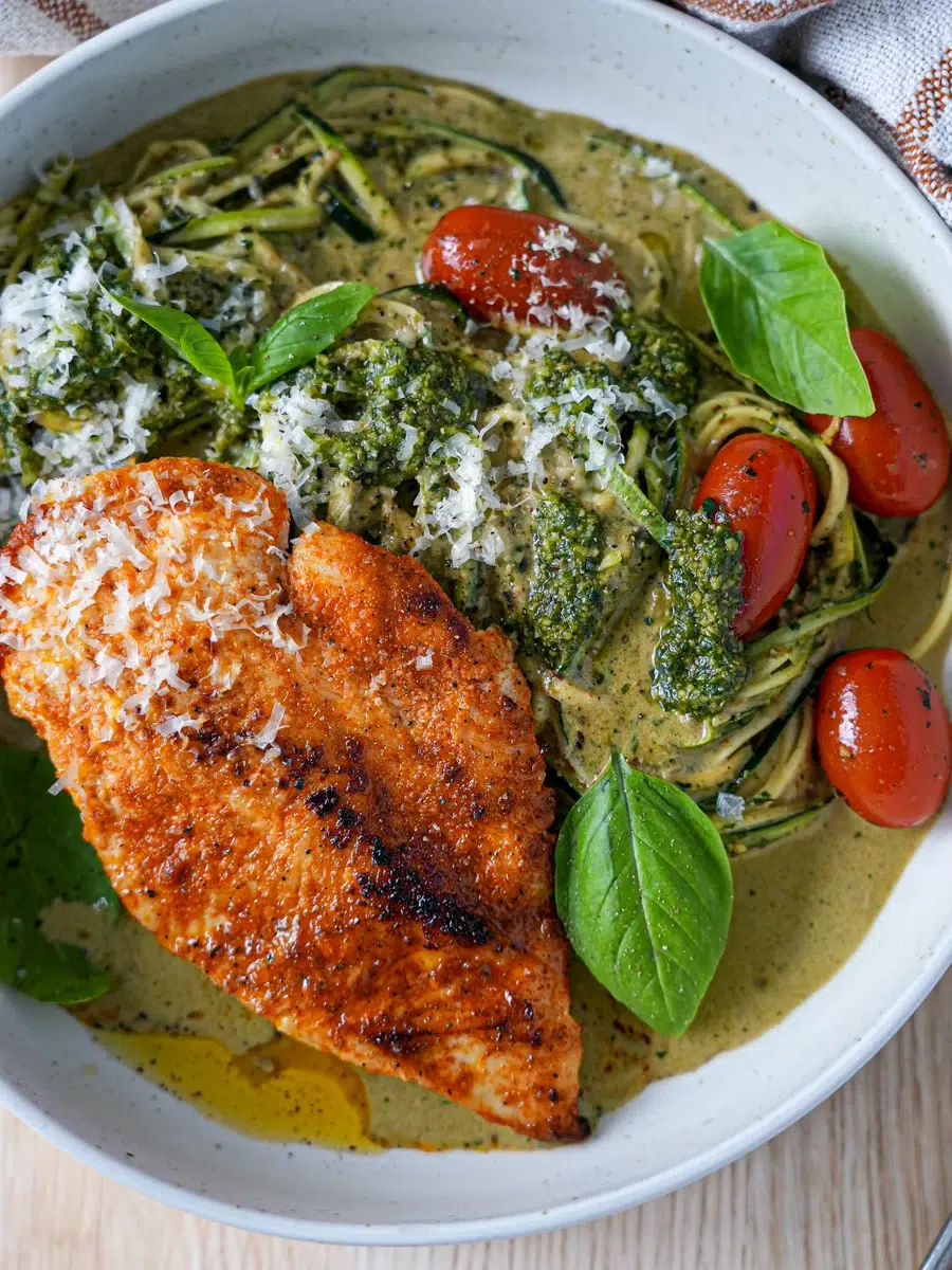 Caramelised chicken breast is cooked in a delicious garlicky, creamy pesto sauce, served with zucchini (courgette) noodles and fresh cherry tomatoes, then topped with parmesan and basil.