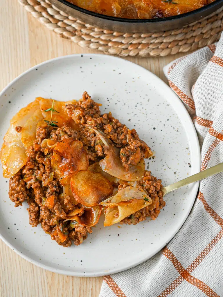 This Crispy Potato Topped Beef “Pie” has quickly become one of my favourite weeknight dinners. It has all the comfort of a cottage pie, but without the hassle of needing to make mashed potatoes – perfect for when I’m short on time and energy. Instead, finely sliced, buttery potatoes create a crispy, golden topping that feels like a total cheat (in the best way). It’s made in just one pan, and the filling is loaded with vegetables that melt into a rich gravy, making it a complete meal in itself. I love this recipe so much that I included it in my new cookbook Simple Dinners Every Day.