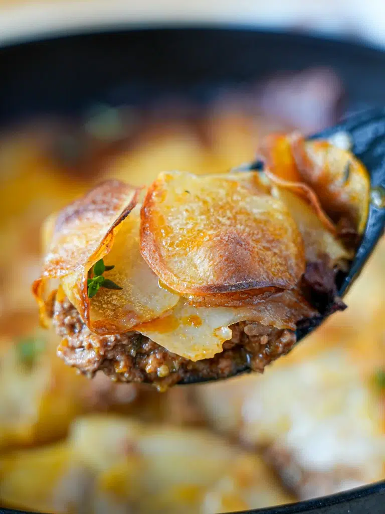 The rich beef filling is absolutely delicious, flavoured with garlic, herbs, tomato paste and brightened with a touch of red wine vinegar, as well as beef stock and Worcestershire sauce for that “umami” (savoury) flavour we are all looking for. The potatoes are sliced super finely (I use a mandoline), then three layers of them, each drizzled with melted butter, top the “pie”. They are cooked until tender but the top of the pie remains crispy and golden.