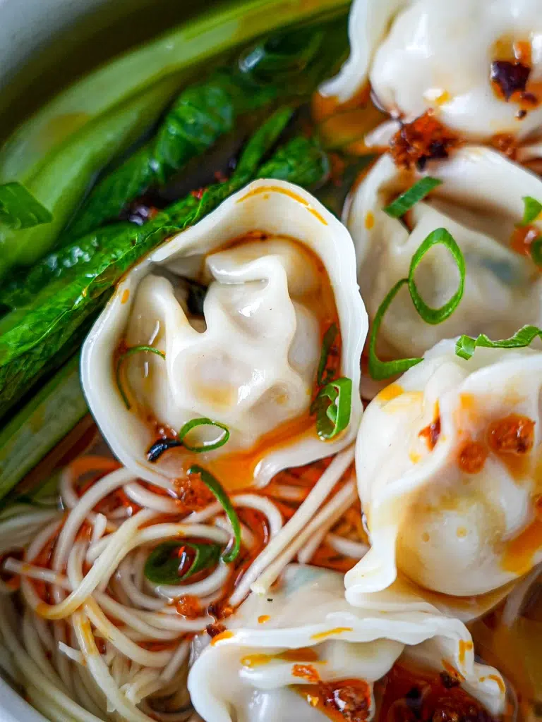 The cooking process is stress-free too. No steaming, just throw the dumplings directly into a chicken broth to take on all the flavour. Only simple, low-cost ingredients are needed for this dish. The dumplings are flavoured with soy sauce, Shaoxing wine (optional), ginger and spring onion (scallion) and cooked in a broth of seasoned chicken stock and noodles. The result is a warming, nourishing meal that is packed with flavour. Any veggies of choice can be added to the soup. We like chinese broccoli (gai lan), but shredded green or wombok cabbage, sliced mushrooms, bok choy, pak choy, broccolini (tenderstem broccoli), snow peas (mangetout), green beans, sliced carrot or bean sprouts all work equally well. The kids enjoy the comforting flavours of this Wonton Dumpling Soup recipe and I love that hubby and I can spice up our versions with chilli oil drizzled on top.